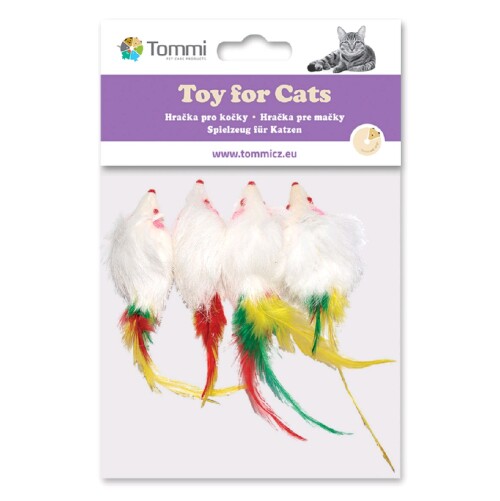 Malá bílá myška má místo ocásku barevná peříčka, tím se stává pro kočky velice atraktivní hračkou. Velikost. 5 cm Balení: 4 ks/sáček (cena uvedena za celé balení)